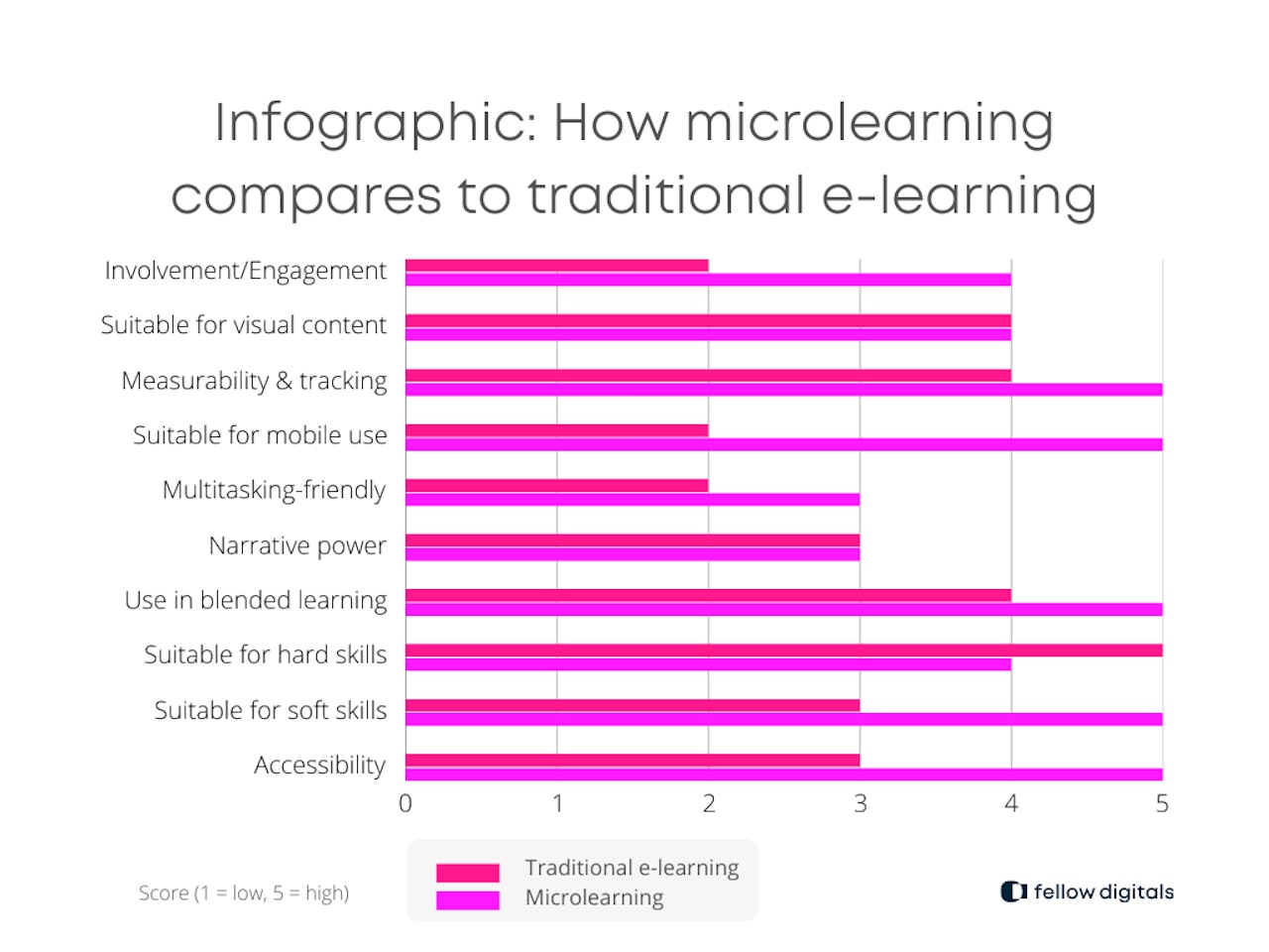 An infographic (generated by AI) makes it clear: microlearning consistently outperforms traditional e-learning — not just in engagement, but also in usability, visual impact, and practical application.